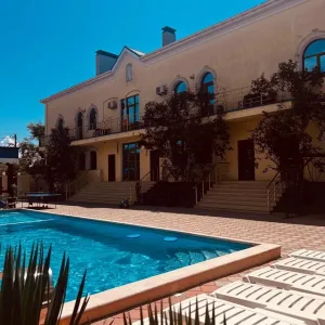Гостевой дом «Миру Мир» в Заозерном (Евпатория, Крым): до моря—500м, до Евпатории—7км. Комфортабельные номера (от «Стандарта» до «Люкса») с санузлом, ТВ, кондиционером, Wi‑Fi. На территории: бассейн с гидромассажем, детская зона, площадка, батуты, теннисный стол. Есть подогреваемый бассейн, парковка.