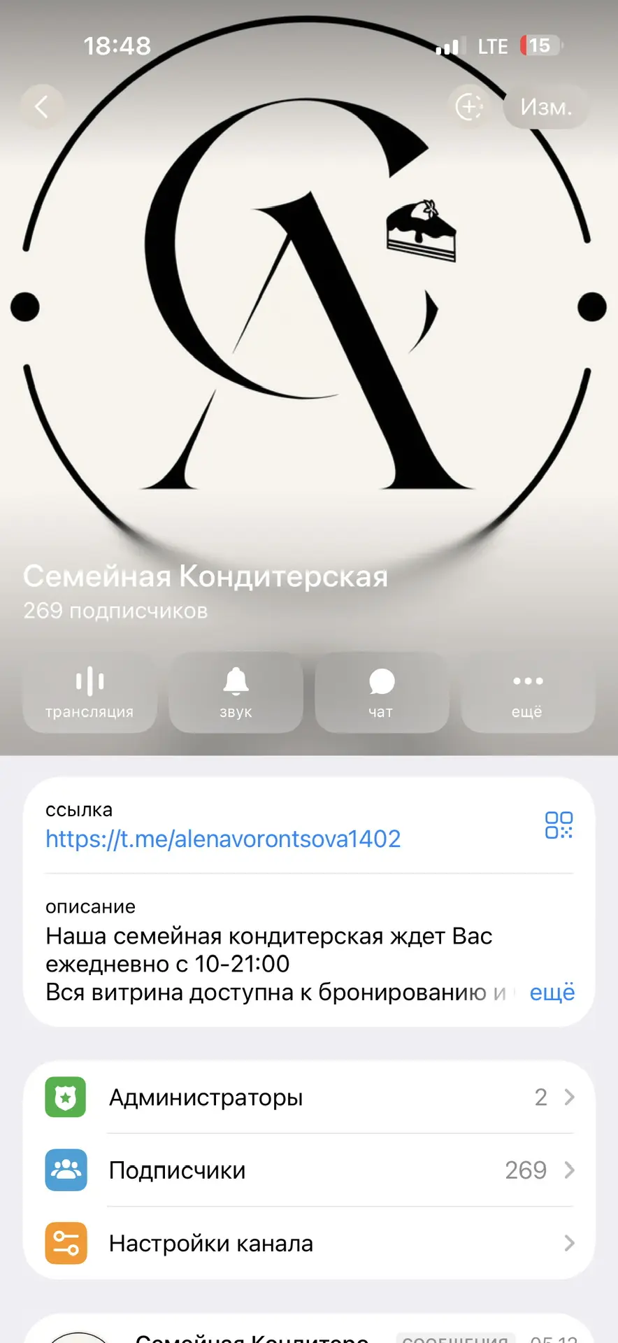 Семейная Кондитерская Алены Воронцовой — это популярный канал в мессенджере MAX. На канал подписано 76 человек, опубликовано 81 постов с актуальным и интересным контентом. Следите за обновлениями канала Семейная Кондитерская Алены Воронцовой и будьте в курсе последних событий.